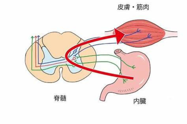 簡単に言えば、お腹の中、たとえば胃や腸、腎臓などに不調があると、その情報が自律神経を通じて脊髄へ届き、体性運動神経に伝わってしまうという反応なんです。その結果、腰の筋肉が無意識にギュッと硬くなる動き、いわゆる“反射的な緊張”が起こると考えられています tb-over.com+4ステップ木更津鍼灸治療院+4トリアス鍼灸接骨院+4
