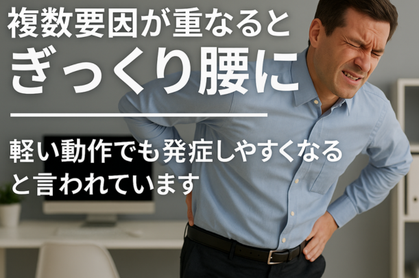 ぎっくり腰は、単一の原因で突然起こるというより、複数の要因が重なった結果として発症することが多いと言われています。例えば、不良姿勢や筋力低下、慢性的な疲労や筋膜の緊張が積み重なり、さらに加齢による体の変化が加わると、腰の安定性が損なわれやすくなります。その状態で急な動作が加わると、ほんのわずかな刺激でも痛みにつながる可能性があると考えられています(引用元:足立慶友整形外科セルフケア整体安曇野 いはら整骨院)。