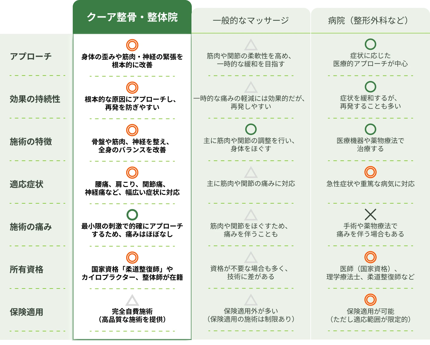 私たちクーア整骨・整体院は、あなたの「痛み」「不調」「不安」をしっかりと受け止め、最適な施術を行います。
